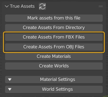 TrueASSETS allows users to create (mark) assets directly from source FBX or OBJ files. These files DO NOT need to already be inside a .blend file to be imported.