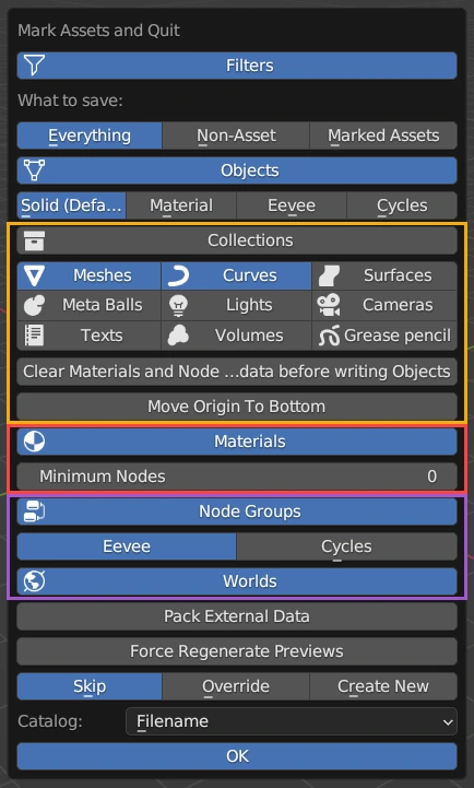 Below is the menu that will appear in the 3d viewport when this option is clicked. This is the "Mark asset and quit" modal and mirrors similar options to the "mark assets from directory" function.