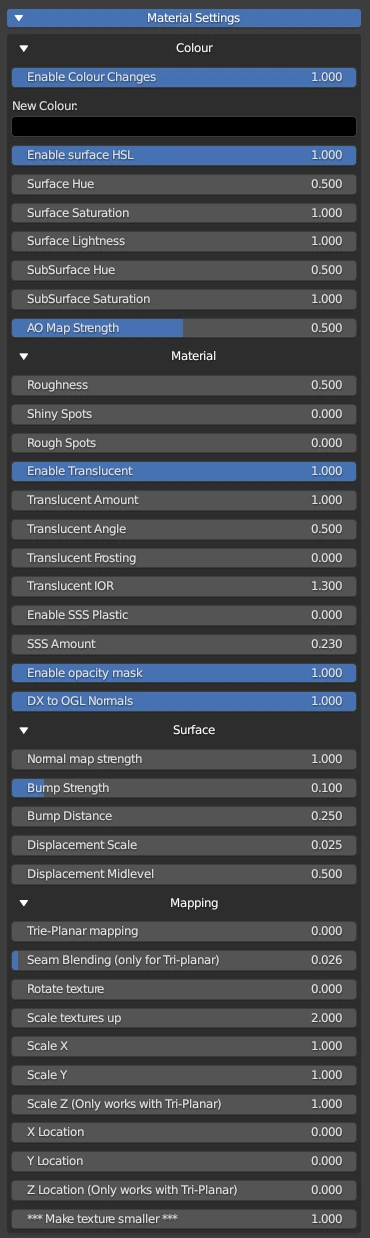 The shader is broken up into 4 distinct sections, in the UI using drop-down functions. This is to make the UI cleaner and allow the user to close information that is not needed. If you view this in the shader-editor, or the material properties, it will not look like the image on the left but will look like this: